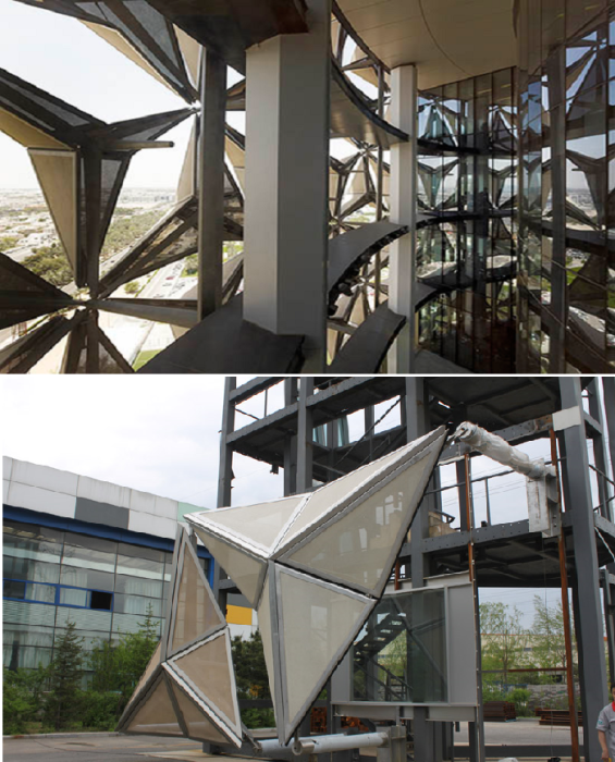 Защитная оболочка состоит из треугольников, покрытых стекловолокном и запрограммированных на движение солнца, чтобы уменьшить воздействие его лучей и предотвратить блики, при этом они не превращают внутреннее пространство в кромешную тьму. Они рационально оптимизируют поступление естественного рассеянного света. С самых первых его лучей, на востоке, полностью закрывшиеся к ночи «лепестки цветов», начинают постепенно открываться, а к вечеру, здания оказываются спрятанными за надежным щитом, преобразующим их до неузнаваемости. По сведениям редакции Novate.ru, исследования и практические результаты показали, что «умный» экран уменьшает солнечное воздействие более чем на 50 процентов, что благотворно сказывается на бюджете компаний и здоровье их сотрудников.