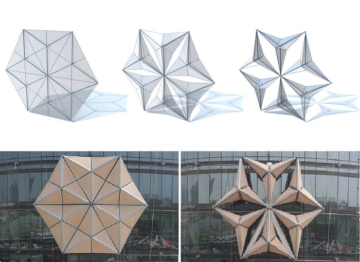 В зависимости от времени суток и траектории движения солнца меняется конфигурация защитного экрана и внешний вид башен (Al Bahar Towers, Абу-Даби).