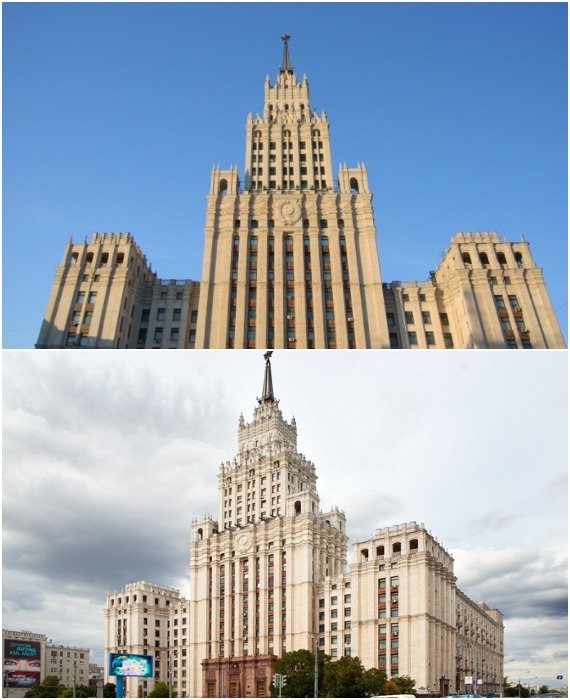 Как и предполагалось, высотка, предназначенная для МИДа, производит должное впечатление даже сейчас (Москва). Кстати сказать, проектом не был предусмотрен шпиль, конструкция здания не рассчитывалась на возведение дополнительного элемента, на котором настоял сам Сталин, утверждая, что «высотка не производит должного впечатления и очень напоминает американские небоскребы». Поскольку спорить в те времена никто не решался, пришлось дополнительно укреплять перекрытия верхних пяти этажей, интегрировать в них опоры, а тяжеленную звезду заменить облегченным гербом. Как оказалось (во время проведения ремонтных и реставрационных работ), этот шпиль является обитаемым. В нем свили гнезда соколы-сапсаны, что затянуло процесс восстановления. К всеобщей радости, после окончания работ, предусматривающих места для гнездования, птицы вернулись в «родные пенаты».