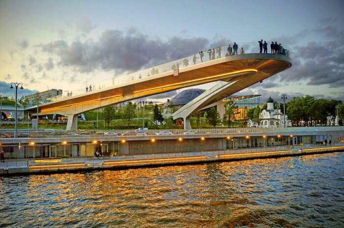 В Москве имеется собственный «парящий» мост (единственный в столице) и находится он в Парке «Зарядье», открывшемся в 2017 году. Учитывая, что это место отдыха горожан и гостей столицы, неудивительно, что Парящий мост выступает в роли смотровой площадки, выдвинутой на середину Москвы-реки. Отличительной чертой уникального инженерного объекта является конструкция, в виде запущенного бумеранга общей длиной 140 метров (по 70 каждая сторона V-образной структуры), зависшая над водой без единой опоры. Скорее всего, чтобы попасть на Парящий мост, придется постоять в очереди, но зато потом можно будет полюбоваться красотой (под редким ракурсом на 15-метровой высоте) Собора Василия Блаженного, Спасской башни, колокольни Ивана Великого, Торговыми рядами и др. достопримечательностями.