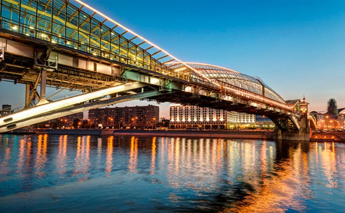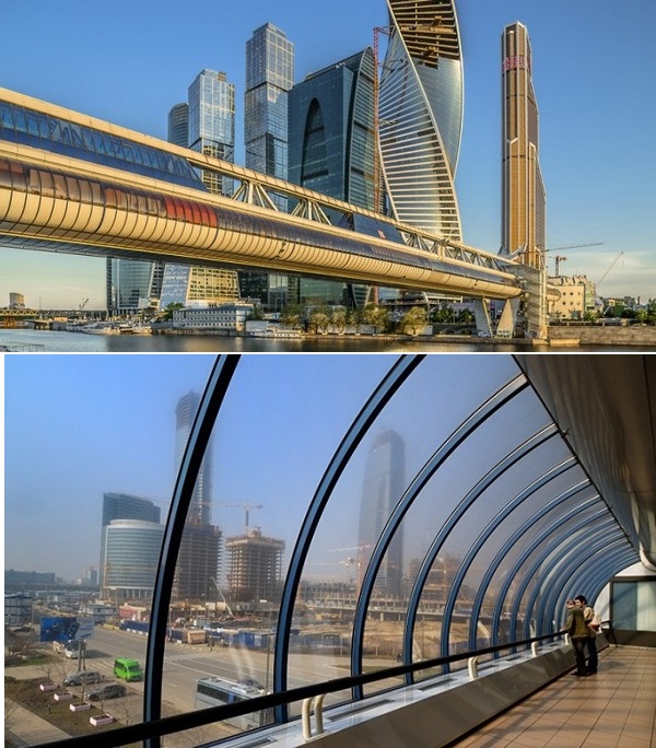 Современные реалии жизни вносят свои коррективы во все сферы нашей жизни и мостостроение не стало исключением. В 1997 году, когда многофункциональный комплекс Москва-Сити только начинал строиться, удивительная во всех отношениях пешеходная переправа (длина 214 м, ширина – 16 м) стала не только связующим звеном между новым комплексом Краснопресненской набережной и станцией метро «Выставочная», но и необычным торговым центром.