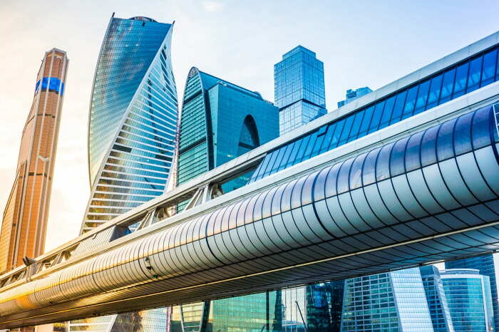 Пешеходно-торговый мост Багратион органично вписался в деловой район Москвы-Сити, который бурно развивается и расстраивается. | Фото: highlights.city.