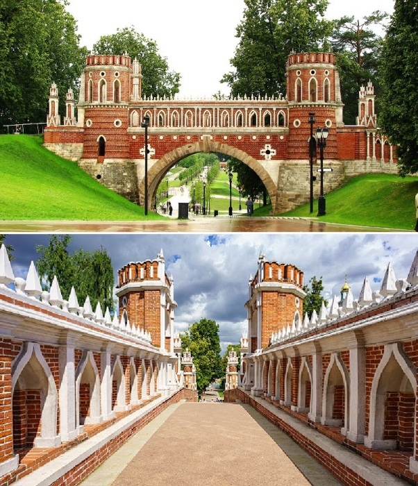 Еще один мост времен правления Екатерины II можно увидеть во дворцово-парковой зоне царской резиденции Царицыно, строительство которой велось по проекту известного архитектора В. И. Баженова. К сожалению, императрица осталась недовольная подмосковной усадьбой и никогда в ней не останавливалась, из-за чего роскошная царская резиденция стала «заброшкой». Зато после современной реставрации посетители особо отмечают красивейший фигурный мост, который возводился в качестве парадного въезда со стороны прудов (совсем неиспорченный предыдущими реставрациями). Красный кирпич, декоративные элементы (орнаменты) из белого камня, высокие башни со стрельчатыми арками, резные каркасы, пирамидки и ромбы – все это создает очарование эпохи XVII- XVIII вв., что редко можно встретить в современном мегаполисе.