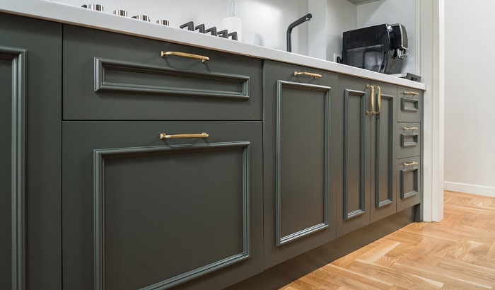 • На первом этапе нужно подготовить старые фасады. Хорошо протрите их от пыли, жирных пятен и других загрязнений, а затем подпишите карандашом внутреннюю сторону каждой дверцы, чтобы после реставрации получилось правильно собрать гарнитур. После этого можете снимать фасады и крепежи. • Нарежьте молдинги по размеру фасадов, а по краям сделайте угол 45 градусов, чтобы места их соединения выглядели аккуратно и эстетично. • В магазине продаются исключительно белые молдинги, поэтому если этот цвет вам не подходит, нужно будет перекрасить их в другой с помощью обычной кисти или краскопульта. Но последний не такой простой в эксплуатации – нужно будет потренироваться. • Когда планки будут готовы, смажьте каждую планку клеем для дерева, прикрепите к фасаду и подождите некоторое время, пока они зафиксируются. • Установите дверцы на место, ориентируясь на проставленные ранее цифры.