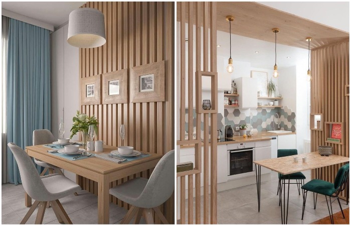 Рейками можно выделить обеденную зону или отделить кухню от гостиной