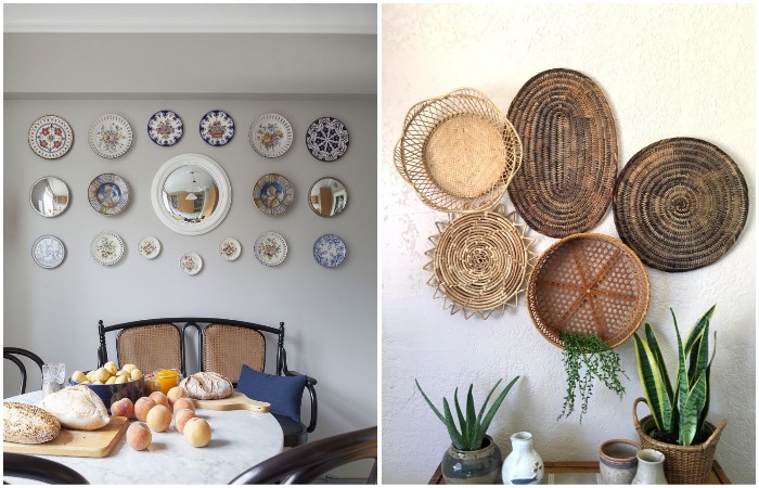 Популярным вариантом декора, особенно в скандинавском и экостиле, являются мягкие тарелки из ротанга. Они добавят в интерьер кухни тепла и уюта. Обратите внимание, что дизайнеры размещают посуду не хаотично, а составляя цельную композицию. Благодаря этому появляются смысл и динамика. Попробуйте расположить декор, например, по диагонали – это будет смотреться намного интереснее, чем в линию.