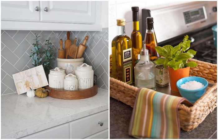 Часто главным источником визуального шума на кухне является столешница. Именно поэтому очень важно, чтобы там не было беспорядка, а также десятка неприглядных вещей, создающих неаккуратный вид. Чтобы нужные предметы всегда находились под рукой и не портили внешний вид кухни, разместите их в плетеной корзине или на подносе. Если кухонных принадлежностей много, разделите их на несколько групп с помощью красиво задекорированных стеклянных банок. Так вы сможете убить сразу двух зайцев: организовать на столешнице порядок и иметь быстрый доступ к популярным девайсам.