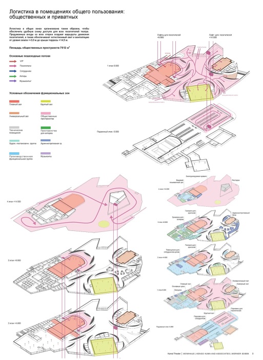 Планировка, распределение зон и маршрутов нового Театра (концепт). Неразрывную часть с природным окружением почувствуют и посетители театра. Особенно заметно это в фойе, призванном стать уютной «гостиной Казани», визуально соединяющим город и озеро, создавая эффектный тандем. «Мы создаем комфортную среду и удобные маршруты для всех работников театра — просторный этаж для артистов и администрации, комфортные студии и мастерские. Мы минимизируем площадь цокольного этажа, чтобы облегчить доступ посетителей и обслуживание самого здания, а также снизить затраты на его строительство и эксплуатацию», – объясняет такое решение руководитель проекта Кенго Кума. Такой подход к конструкции здания и распределению пространства позволил сделать входы со всех сторон здания, которые являются органичным продолжением пешеходных маршрутов, обеспеченных как естественным освещением, так и вентиляцией, что немаловажно для энергетической эффективности здания.