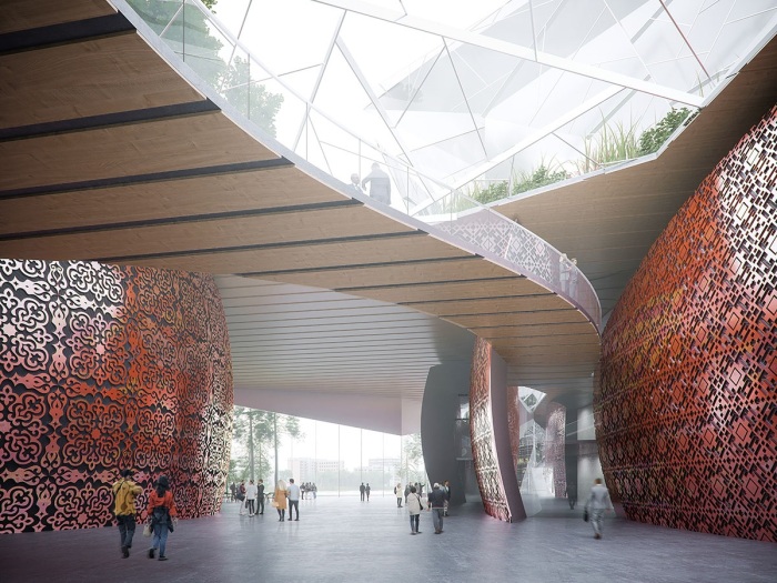 Фойе нового театра призвано стать «гостиной Казани», где посетители смогут ближе познакомиться с традиционной культурой республики (концепт Театра Камала). | Фото: designboom.com.