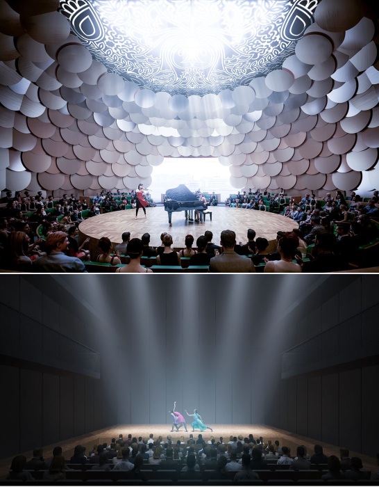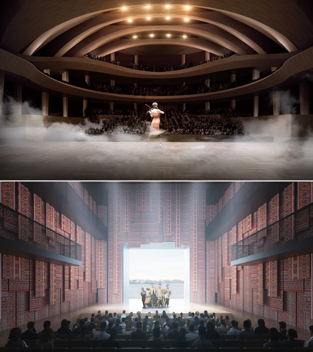 Структура нового театра подразумевает обустройство трех масштабных залов (Главный, Универсальный и Восточный), а также творческую и образовательную лаборатории, общественное пространство (рендеринг).