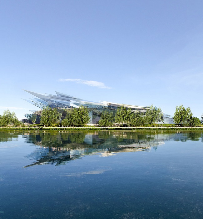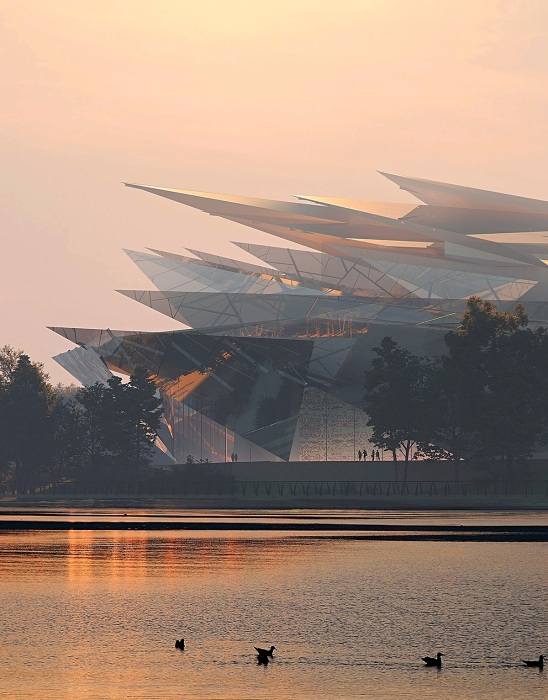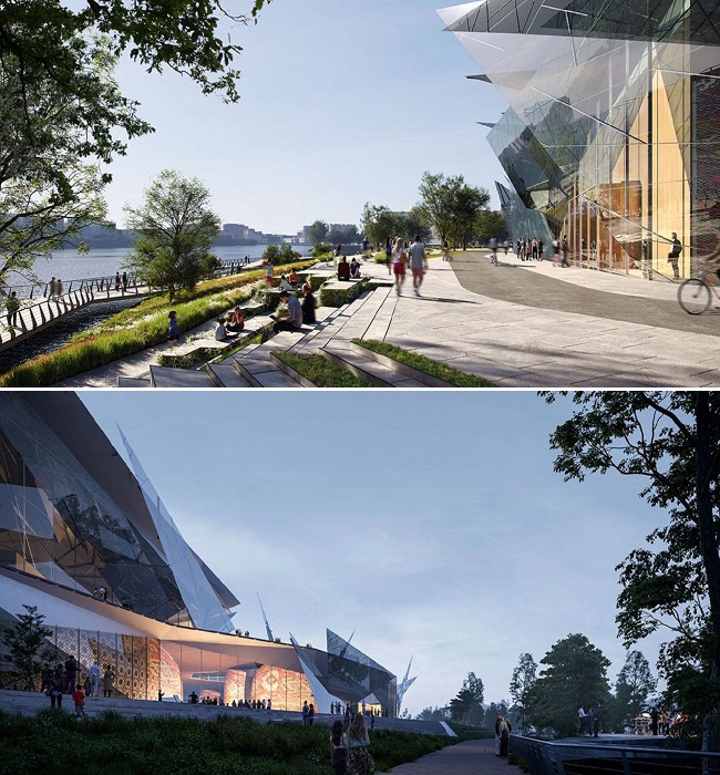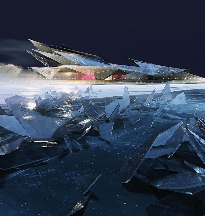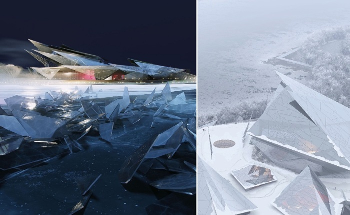 Как уже было сказано, футуристическая форма, созданная из треугольных стеклянных панелей, расположенных под разным углом, не только перекликается с парусником, нынешнего здания, она напоминает «ледяные цветы». И это не метафора, оказывается, в зимнее время, когда водная гладь озера замерзает, на его поверхности появляются структурированные образования, напоминающие лепестки, что по своей сути является редким природным явлением. Ожидается, что такое сходство, зимой – позволит объемной структуре слиться с ландшафтом, становясь одним целым с обликом озера. Летом же, многочисленные отражения окружающего пространства в стеклянных фасадах, лишний раз подчеркнут единство архитектурного сооружения с природой.