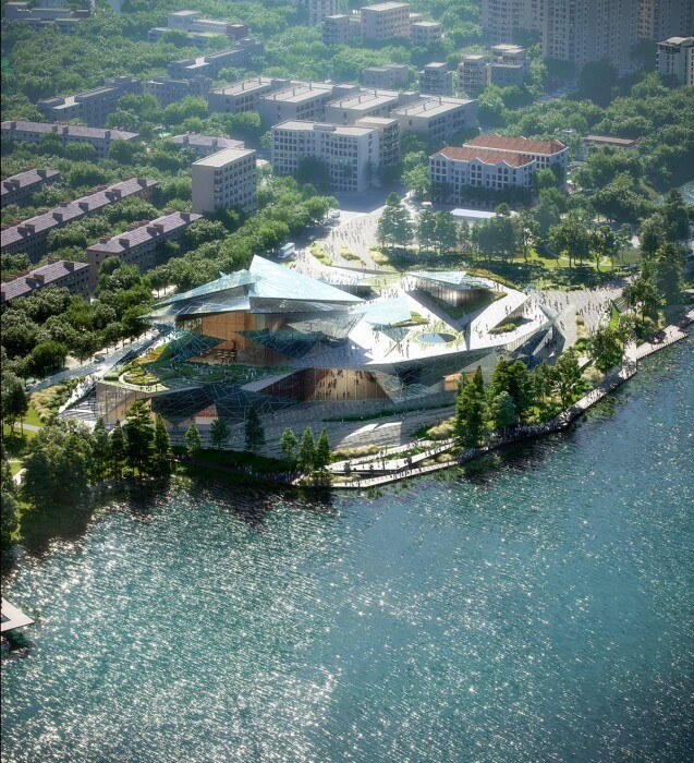 Новая архитектурная доминанта органично связана с уникальной экосистемой озерной цепи Кабан (визуализация проекта Театра Камала). | Фото: metalocus.es.