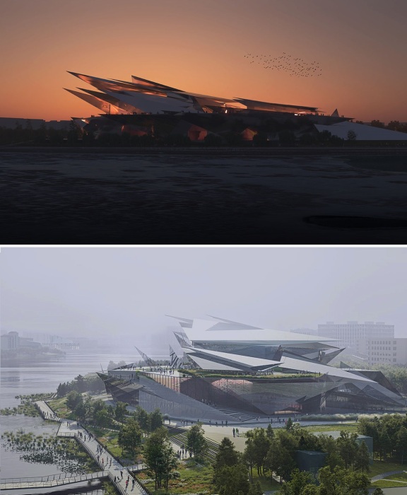 Впечатляющая геометрия нового здания, вдохновленная духом народа Татарстана и редким природным явлением, образующимся на ледяной поверхности озера Кабан (концепт Театра Камала). | Фото: worldarchitecture.org.