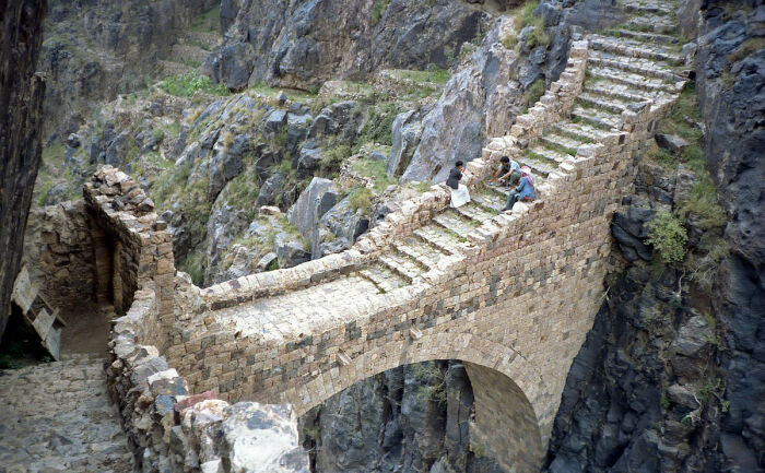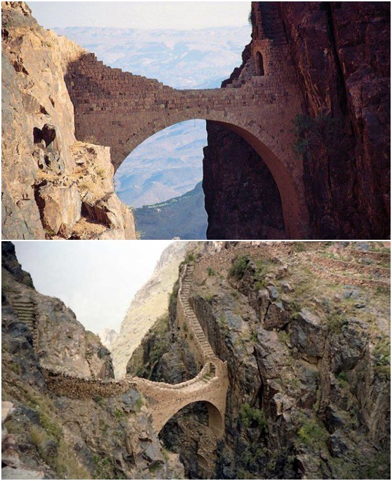 Простираясь через ущелье глубиной 91 метр между двумя вершинами каньона, мост Шехара до сих пор широко используется гражданами, живущими в горных деревнях (Амран, Йемен). | Фото: ancient-origins.net.