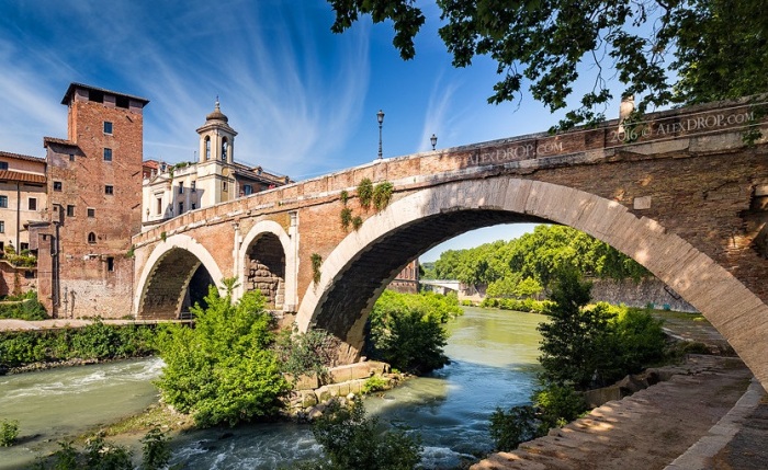 Мост Фабриция (Pons Fabricius), расположенный вдоль реки Тибр и соединяющий не два противоположных берега, а материковую часть с одноименным островом, – это старейший мост Италии, появившийся на этом месте в 62 году нашей эры. Название моста связано с именем его создателя – Луция Фабриция, который был куратором дорог в Риме. Учитывая возраст инженерной конструкции и то, что на его долю выпало немало испытаний как со стороны природы, так и людские передряги/войны, становится понятным почему он повергался реконструкции. Кстати сказать, ни одна их них не сказалась на внешнем виде переправы и не изменила ее структуру, даже несмотря на то, что он несколько раз менял свое название.