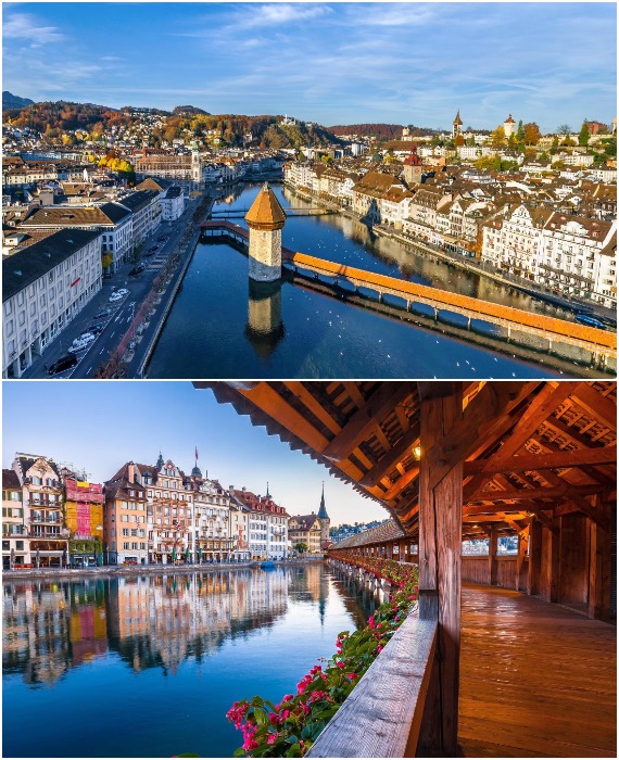 Зигзагообразный деревянный мост Капелльбрюкке, огибающий восьмигранную каменную башню, издревле является символом швейцарского города Люцерн. | Фото: myswitzerland.com.