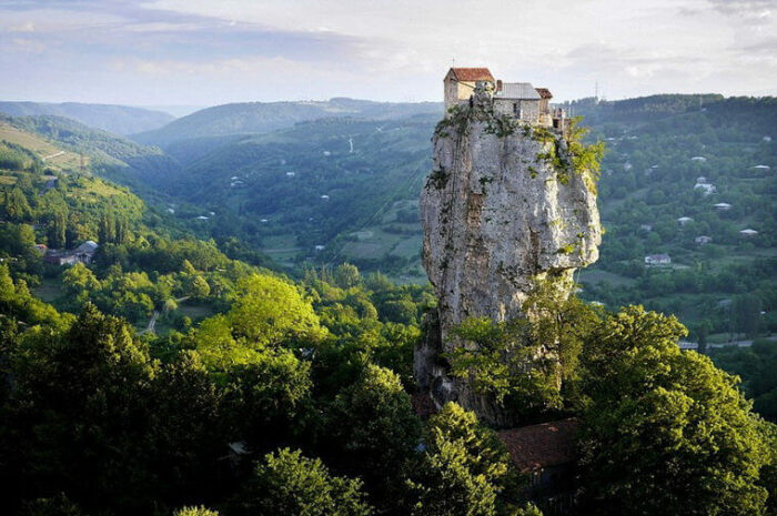 В числе самых неприступных и уникальных святынь мира стоит отметить интересную обитель – церковь Преподобного (Святого) Максима Исповедника на вершине Кацхийского столпа в Грузии. Природное образование, которому много миллионов лет – 40-метровый известняковый монолит еще в дохристианские времена считался священным местом. Язычники верили в то, что на его неприступной вершине обитает бог плодородия. Во времена же христианства на вершину столпа стремились отшельники, считающие трудность подъема платой за то, чтобы искупить грехи и приблизиться к Богу.