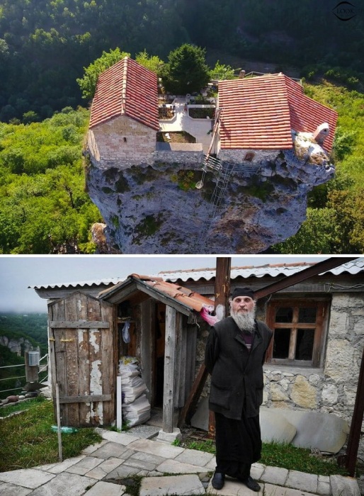 Восстановленная церковь и один из монахов-отшельников, обитающих на вершине столпа (Церковь Преподобного Максима Исповедника, Грузия).
