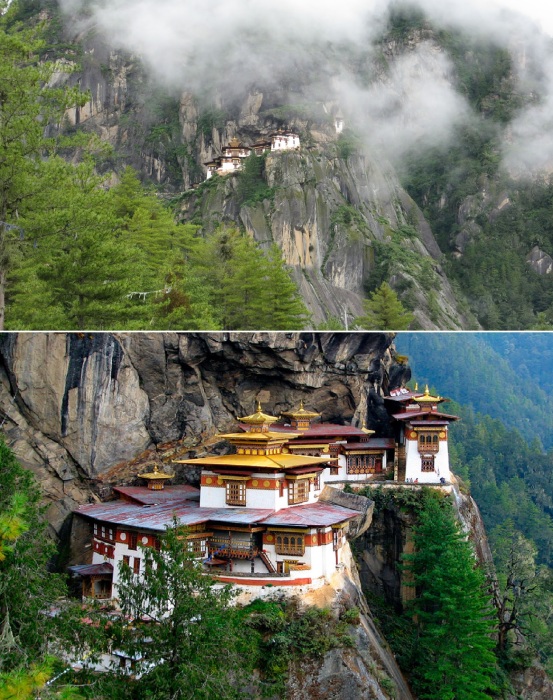 Монастырь Такцанг-Лакханг – уникальнейший буддийский монастырь мира хоть и находится в одном из самых крошечных его государств – в королевстве Бутан, тем не менее считается одной из самых почитаемых святынь. «Логово тигрицы», именно так переводится название монастыря Такцанг-Лакханг, интегрировано в отвесной склон скалы на высоте 700 метров от дна ущелья (общая высота над уровнем моря 3120 м), над которым «парят» колоритные строения. Стоит отметить, пещеры в склоне горы издревле привлекали тех, кто мечтал приблизиться к Богу, усмиряя свою плоть и желания, но тот архитектурный комплекс, который мы можем увидеть сегодня датирован XVII веком.