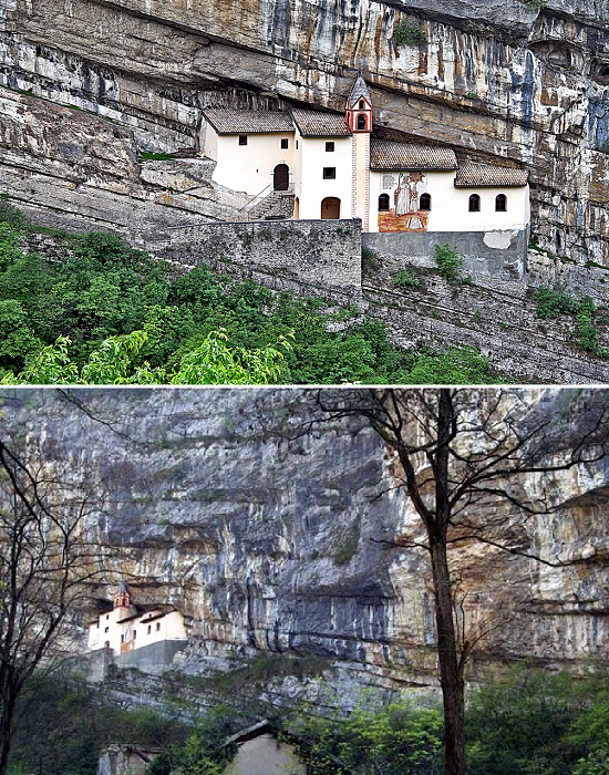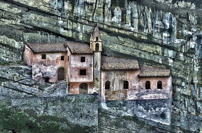Древнейший католический монастырь Сан-Коломбано завис между вершиной перевала и горным ручьем Лено, проходящем на дне ущелья (Тренто, Италия).