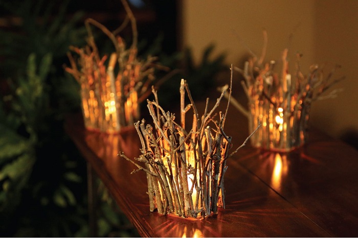 В качестве основы для светильника удобно использовать вазу или стакан, если изделие планируется небольшого размера. Для начала следует обезжирить поверхность, а затем пройтись по стеклу наждачной бумагой, чтобы клей лучше зафиксировал ветки. Установите лампу в абажуре внутрь вазы, а затем с помощью клея-пистолета приклейте ветки по всей окружности. Обратите внимание, что ветки необязательно должны быть одной длины и толщины – некая хаотичность придаст готовому светильнику особый шарм. В конце композицию можно украсить ветками и покрасить, а можно оставить в первоначальном виде – как вам больше нравится. Кстати, вместо лампы подойдет обычная свеча-таблетка.