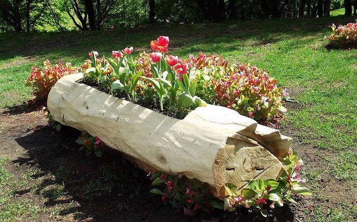 Оригинальная клумба в бревне дерева. / Фото: stroiteh-msk.ru