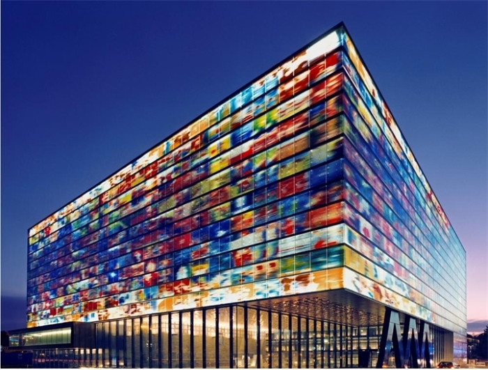 Здание Нидерландского Института Звука и Изображения, спроектированное архитекторами Виллемом Я. Нептелингсом и М. Ридейком – известный архитектурный шедевр, при возведении которого использовались уникальнейшие инновационные разработки. Новаторский проект здания, которое служит архивом для документов национального телерадиовещания, площадкой для новых разработок и одним из самых популярных в Голландии музеев, был очень сложным реализации несмотря на технологические возможности современной индустрии. Но усилия того стоили, особенно когда речь заходит о фасаде (обладает главной притягательной силой), созданном с одновременным использованием нескольких сложнейших техник обработки стекла, окончательным этапом которых стало перенесение рисунков на его поверхность. Об их сохранности позаботились особым образом, выработав уникальный технологический процесс – моллирование, предполагающий плавление стекла при температуре 820 градусов, вызывающий незначительное деформирование и соединение в керамическим слоем, запечатывающим рисунок.