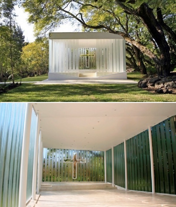 В мексиканском городе Куэрнавака, который находится недалеко от Мехико, есть своя достопримечательность, равной которой сложно найти в мире. Речь идет о Часовне Ла Эстансия (La Estancia), являющейся частью садового комплекса, где проходят церемонии бракосочетания. Среди роскошной зелени и экзотических цветов спрятан полностью стеклянный павильон, идеально интегрированный в атмосферный ландшафт. Авторы Novate.ru хотели бы отметить, что разработкой проекта занимались специалисты студии Bunker Arquitectura, которым удалось создать воздушную конструкцию, в которой неожиданным образом закреплены панели из стекла – на расстоянии 10 сантиметров друг от друга. Это позволило отказаться от металлической конструкции, которую всегда видно, а также избежать парникового эффекта, ведь невидимые издалека пролеты, позволяют продуваться помещению Часовни, создавая комфортный микроклимат, так что ничто не омрачит впечатления от запоминающихся на всю жизнь мероприятий.