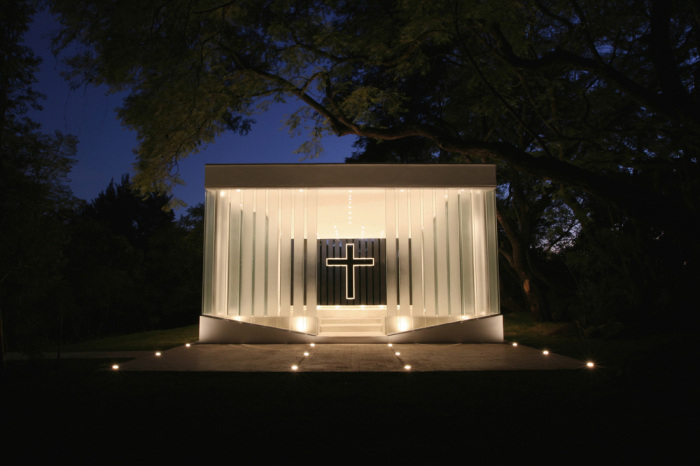 В ночное время, встроенная подсветка преображает часовню, привлекая туристов и новобрачных со всего мира (La Estancia, Мексика). | Фото: karmatrendz.wordpress.com.