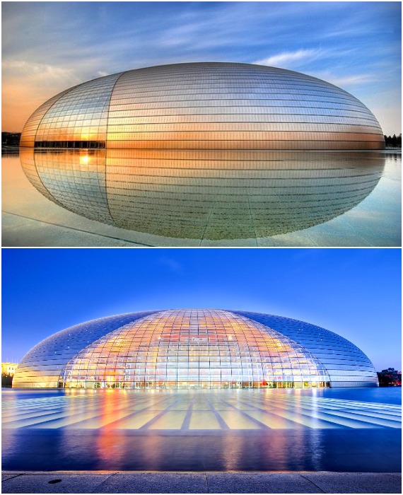 Фантастический объект из стекла и стали, отражаемый в водах искусственного озера, спроектировал французский архитектор Пол Эндрю (Национальный центр исполнительских искусств, Пекин).