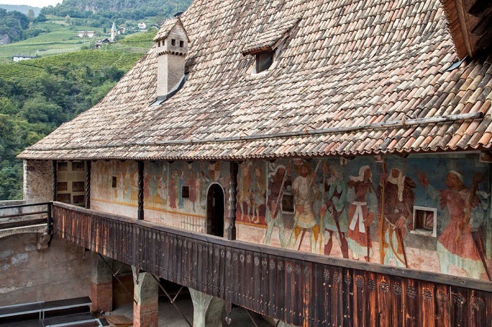 А ещё через сто с лишним лет, в 1385 году он был приобретён богатыми братьями-купцами Никлаусом и Францем Винтлерами из Бозена. Именно по инициативе братьев Винтлер была произведена обширная перестройка замка: построили новую защитную стену и ров, а также множество других помещений и зданий. Тогда же часть сооружений, например Летний Дом, расписали фресками - именно благодаря им замок сегодня знаменит среди туристов. Сюжеты фресок имели литературное происхождение, в частности, изображая короля Артура и его рыцарей, Тристана и Изольду, Дитриха фон Берна. Однако через несколько десятилетий в результате очередной междоусобной войны замок снова сменил владельца.