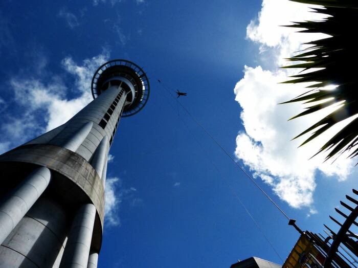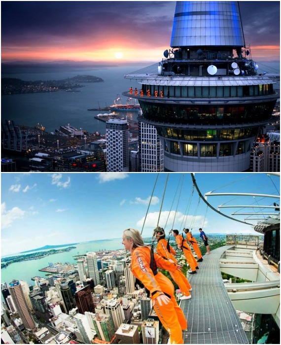 В Окленде на высоте 193 метра можно прогуляться по неогороженной круговой смотровой площадке, правда, без особого костюма и снаряжения туда не пустят (Skywalk, Новая Зеландия).