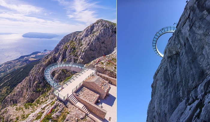 В 13 километрах от популярного города-курорта Макарска (Хорватия) в природном парке Биоково, охватывающем одноименный горный массив, имеется своя поднебесная достопримечательность – смотровая площадка Skywalk Biokovo. Обустроенная на высоте 1228 метров, имеющая прозрачные полы и отступающая полукругом от кромки скалы, она станет настоящим испытанием для отважных посетителей, которые будут награждены потрясающими видами на Адриатическое побережье и заповедную зону. Бывалые путешественники утверждают, что в ясную погоду можно увидеть даже побережье Италии, но так повезло не каждому посетителю.