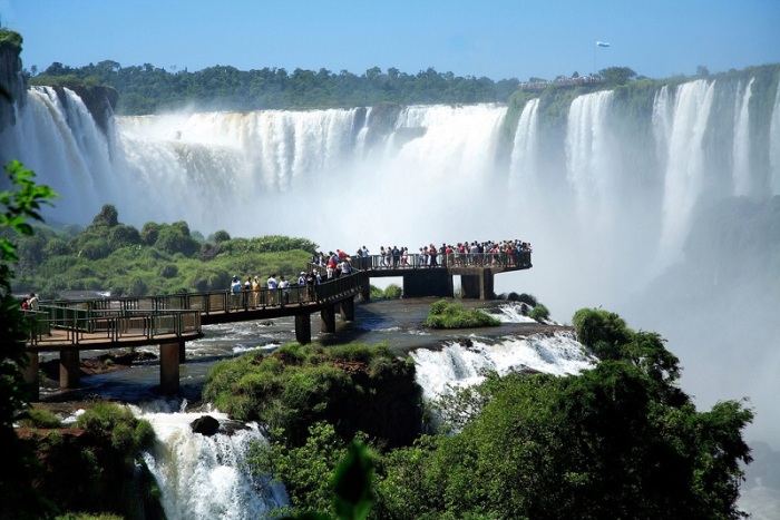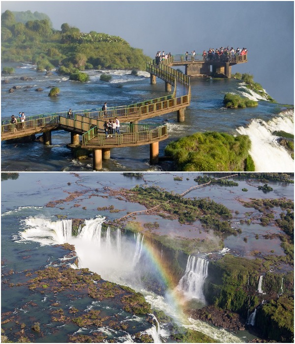 Водопад – это само по себе захватывающее зрелище, а если он окружен тропической зеленью, имеет множество потоков и постоянно образует гигантских размеров радугу, то восторгу не будет предела, особенно у любителей инстаграмных снимков. Чтобы в разы усилить экстаз посетителей, устремляющихся к водопадам Игуасу, растянувшихся сразу на две страны – Бразилию и Аргентину (он из разделяет), новаторы от туристической индустрии построили смотровую площадку-мост прямо посреди бурлящего потока на 250 метровой высоте. С видового моста открывается нереальный вид на обширный поток, падающий с 80-метровой высоты и всю экзотическую округу. Разбиваясь на миллионы охлаждающих брызг тонны воды, способны привести в чувства даже самых смелых путешествующих, ведь придется прогуляться среди бушующих потоков воды, которые в свою очередь устремляются вниз с плато, а это, дополнительная порция завораживающей красоты.