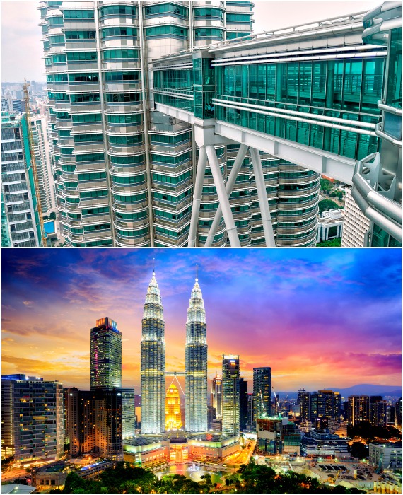 Между самыми высокими башнями-близнецами в мире проложен «небесный мост», который стал поразительной смотровой площадкой страны (Башни Петронас, Малайзия). | Фото: kolllak.livejournal.com.