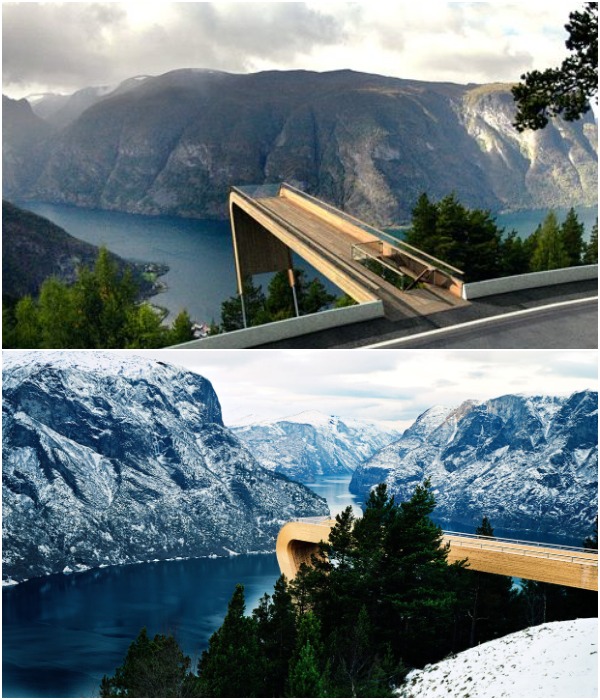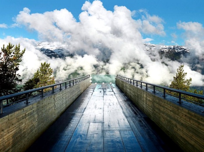Если издалека посмотреть на смотровую площадку, спрятанную среди роскошной зелени норвежских лесов, то кажется, что на вершине скалы построили трамплин для лыжников, которые вот-вот отправятся на старт, демонстрировать свое мастерство. Но это только иллюзия, на самом деле архитекторы Тодд Сондерс и Томми Вильгельмсен именно такой увидели смотровую площадку, зависшую на высоте 650 метров над живописным Эурландским фьордом. Им пришло в голову создать неожиданную структуру из дерева, точнее сказать обмануть посетителей, ведь конструкция «лыжного трамплина» сделана из стали и надежно закреплена в бетоне, но путешествующие видят лишь дерево, которое пугает не меньше нежели край площадки шириной 3,3 м, заканчивающейся пустотой на расстоянии более чем 30 метров от кромки дороги, откуда она и начинается. Естественно, так кажется издалека, если подойти к резкому закруглению «трамплина», переходящего в опору, то можно увидеть стеклянное ограждение, которое убережет посетителей и хорошенько пощекочет нервы.