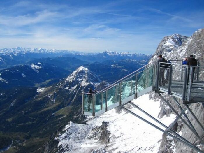 Смотровая площадка на австрийском леднике Дахштайн (SkyWalk Bridge Dachstein) имеет говорящее само за себя название – «Лестница в никуда». Подвесной мост на высоте около 2,75 тыс. метров над уровнем моря, заканчивающийся скользящей вниз площадкой из стекла, позволяет увидеть всю красоту австрийских Альп и жуткую глубину ущелья, если, конечно же, удастся преодолеть все страхи и ступить на ее прозрачный пол.