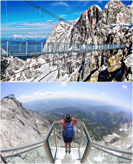 Подвесной мост с прозрачными ограждениями и полностью стеклянная видовая площадка – особо примечательный адреналиновый аттракцион (SkyWalk Bridge Dachstein, Австрия).
