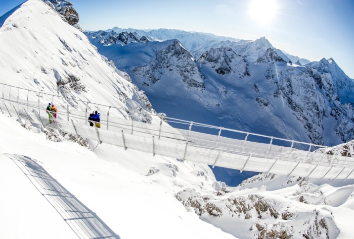 Гости швейцарского курорта Энгельберг могут прогуляться над жуткой пропастью без риска для жизни, но адреналин точно будет зашкаливать. В этом экстремалам поможет подвесной мост Titlis Cliff Walk, который используется в качестве туристической приманки, ведь каждый его метр является смотровой площадкой, зависшей на высоте свыше 3 тыс. метров (!) над уровнем моря. Несмотря на высокие ограждения прогуляться по постоянно раскачивающейся переправе длиной в 100 метров (при ширине всего 1 м) решится не каждый, но вид с нее открывается действительно шикарный. Хотя что может остановить заядлых адреналинщиков или тех, кто любой ценой мечтает заполучить самые восхитительные снимки панорамы швейцарских Альп.