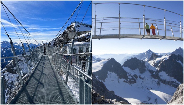 Построенное между двумя скалами на высоте 3 тыс. метров над уровнем моря, чудо инженерной мысли является самым высоким подвесным мостом в Европе (Titlis Cliff Walk, Швейцария).
