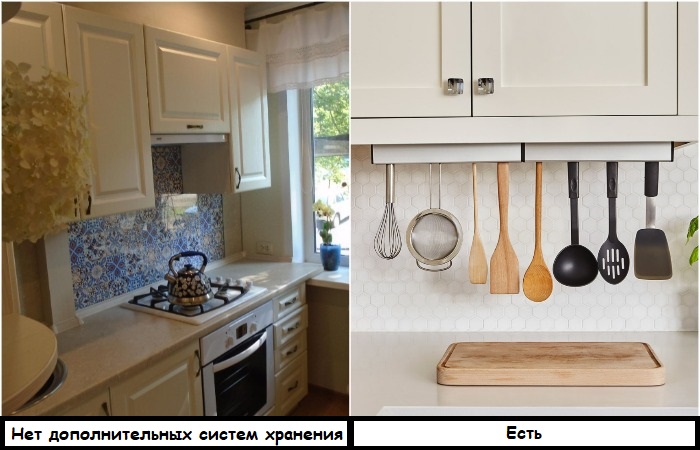 • бумажные полотенца на специальной перекладине; • ряд крючков, подходящих для хранения прихваток, полотенец и прочего текстиля; • бокалы на специальных конструкциях; • лопатки, половники и прочие кухонные принадлежности на «карнизе».