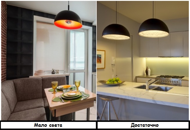 Специалисты рекомендуют еще на этапе ремонта спланировать освещение, чтобы рабочая зона не испытывала недостатка в свете. Отличным решением является встроенная подсветка, led-лента, споты, трековые системы. Если стиль интерьера позволяет, установите небольшие светильники, которые работают от аккумулятора или на батарейках – они также подарят немного дополнительного света. Позаботьтесь и о мощных лампочках в люстре – более яркое фоновое освещение придется как нельзя кстати, особенно если на кухню попадает минимум света с улицы.