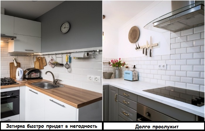 Фартук – еще одна больная тема на кухне. Мало того, что нужно подобрать красивую и практичную плитку, простую в уходе, так еще и о затирке следует подумать. Сразу скажем, что белая цементная затирка – плохой вариант. Она очень быстро пачкается, а очистить ее от жирных капель невероятно сложно. С течением времени швы просто теряют свою белоснежность и кухня выглядит неопрятно.