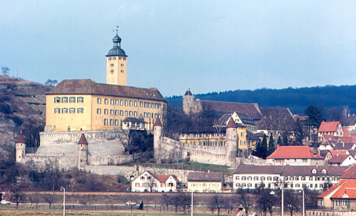 Первоначальный объект, известный как Замок Хорнек, в 1255 году был подарен тевтонским рыцарям конрадом фон Хорнеком. Во время правления Эберхарда фон Зайнсхайма (1420-1443 гг.) и вплоть до Крестьянской войны в 1525 году его использовали в качестве главной резиденции великого магистра ордена. Во время бунта замок был разрушен, а резиденция магистра перенесена в Мергентхайм. Впоследствии замок Хорнек восстановили, точнее сказать, возвели более мощный и величественный объект (1533 г.), который спустя два столетия реконструировали, благодаря чему в его очертаниях угадываются черты барокко.