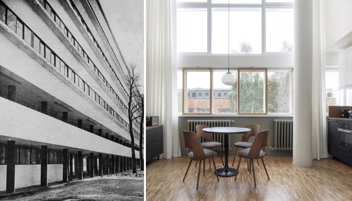 Масштабное горизонтальное остекление и двухуровневая высота гостиной делали квартиры светлыми и объемными, даже если жилая площадь была вполне стандартной (Дома Наркомфина, Москва).