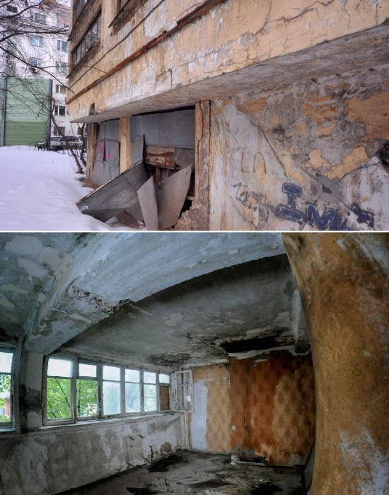Три десятка лет что фасад, что интерьеры были в удручающем состоянии (Дома Наркомфина, Москва).