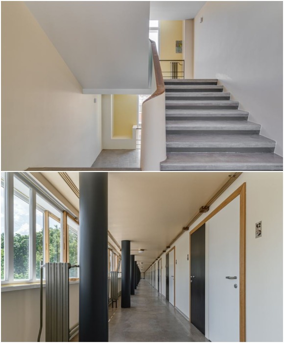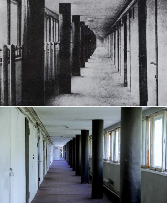 Просторные коридоры с колоннами и ленточным остеклением, вошедшие в 5 принципов современной архитектуры, провозглашенных именитым архитектором Ле Корбюзье (Дома Наркомфина, Москва).