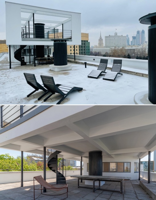 Дом Наркомфина – впечатляющий пример использования в жилищном строительстве функциональной крыши, которая как нельзя лучше способствует социальному взаимодействию жильцов, в каком бы обществе или в непростую эпоху они не обитали в этом доме (Москва).