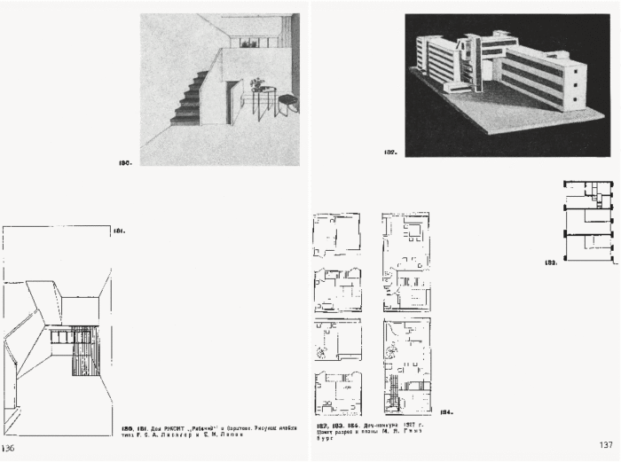 Разворот главы «Экспериментальное строительство домов переходного типа» (Гинзбург М. Я. Жилище: Опыт пятилетней работы над проблемой жилища. — Москва, 1934). | Фото: architectural-review.com.
