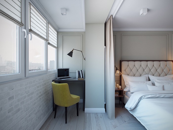 Кабинет на балконе обычно оформляют, если он граничит со спальней или отличается маленькими габаритами – так проще уединиться, чтобы поработать в тишине. Глухую стену можно заменить на стеклянную перегородку, чтобы она пропускала больше естественного света и экономила полезную площадь комнаты. Правда, в этом случае есть риск, что вы будете отвлекаться на членов семьи, находящихся в спальне, когда вы работаете.